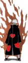 Konan (小南?) is the only female ninja in Akatsuki. As such, Kishimoto originally wanted her to have an obscene appearance showing more of her bust.[76] Being a partner of Nagato, Konan was also a pupil under Jiraiya after she was orphaned as a child by one of Amegakure's many wars and forced to fend for herself. Because she serves under Pain, she is referred to by villagers of Amegakure as "God's angel". Though she worries for Nagato as he was straining himself from having his Pains battle Naruto, she respects his wishes to stand aside so that he and Naruto might meet face to face. While under Jiraiya, Konan learned to take advantage of her natural talent with origami, using it as a key component in her battle style.[86] Konan can divide her body into countless sheets of paper, which she controls and reshapes remotely to scout out an area, form weapons for attack, or create wings that mirror her title. However, Konan's abilities are restricted when the paper is wet; since paper will cling to itself and lose its stiffness. After Nagato's death, Konan withdraws her position in Akatsuki and leaves the organization, pledging the support of Amegakure to Naruto and Konoha.[89] In the Japanese anime, Konan's seiyū is Atsuko Tanaka.
