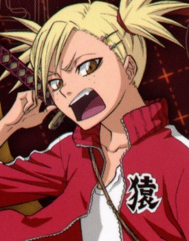 Description: former lieutenant of the 12th Division under captains Kirio Hikifune and Kisuke Urahara. She viewed Hikifune as a mother figure, and thus initially refused to accept Urahara as her replacement. Hiyori is a tiny, blonde-haired girl with a fierce temper and violent tendencies. Her hair is worn in pigtails and she wears a red jogging outfit decorated with the first kanji of her name (猿 saru, meaning "monkey"). She also has a tiny fang on the left side of her mouth. Hiyori often abuses Shinji Hirako, usually by slapping him with one of her sandals or using him as a human shield when necessary. This behavior dates back to her time as a lieutenant, despite the fact that Shinji outranked her then.