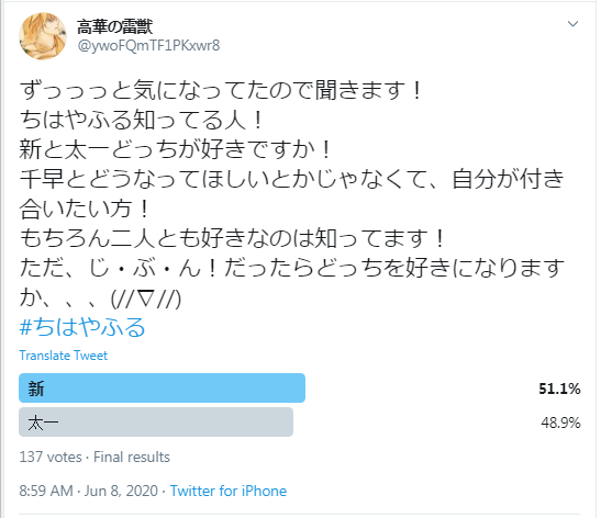 It is currently conducting a popularity poll for Chihayafuru characters, launched on Jun 4th, the poll will remain open for votes until Jun 11th 00:00 Japan time. Most Chihayafuru characters are present in the poll and there is also an option to request a forgotten character in case there is one. And until today (for 4 days), Arata is voted as the most favored character among 1992 fans who voted for now with 32.3% of votes, the rest are divided on 31 other characters, our beloved Chihaya is in 4th place. Some Arata fans also took the opportunity to express their thoughts after voting: He has a strong core and a cool attitude as he never slacks off in his efforts. Arata is the only choice as Chihaya's partner. I love Arata! Straightforward, hardworking and kind hero. Arata is strong and kind. I think he is the one who started the story "Chihayafuru". I voted for Wataya Arata. I can feel the strength of his passion for competitive karuta. I also feel some [of his passion] for Chihaya. I hope that he will carry through these feelings. I love Arata, who is Karuta genius but never neglects working hard. Arata. I wish I had met someone like Arata when I was a kid. Maybe it would have changed my life. I love Arata! No matter what others think, Arata does what what he loves. เซฎโ หถ•โค•หถ โแ ./ใฅ~ ๐ Pss: there is someone who commented saying: As the Taichi vote grows and the gap closes, the Arata vote appears to be growing. I am not sure, but it seems as if foreigners are manipulating these votes. Please double check. ๐. I AM ALL FOR DOUBLE CHECKING!Shame I can't tell this person that if "foreigners" voted, Arata wouldn't have taken the lead to begin with, he is not the most popular overseas, we already know this (or think at least) and that's not what the itMedia service is trying to investigate here. Also I wonder how many people requested a "double-check" when "oveseas" fans really voted and really cheated! โแต.ห.แตโ UPDATE - - - - - - - - - - - - - - - - - - - - - - - - - - - - - - - - - - - - - - - - - - It's June 11 in Japan, the poll closed and Arata kept his spot on top. He won with 839 votes vs 727 votes for the second character in the list. A last comment was added to remind everyone why Arata won and why fans voted for him: Arata! Honest, kind and cool! This is what Japanese fans said about this poll, it's a tested "One vote per IP this time" contrary to the previous one that required an email and it's super easy to vote with multiple emails! but to be fair, it's not impossible to cheat but it is hard and consuming and nothing points to a bot behavior, the results changed moderately & normally. |