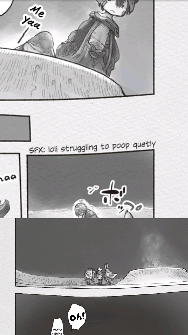 Lmao we got the pooping loli noises. Well it's a weird choice to blend the Golden City backstory in throughout the first bit of this season. There is quite a natural buildup to that backstory being revealed and it is done for the purpose of telling Riko and the gang about the history of the place and such. I wonder how they will weave that bit into the story.