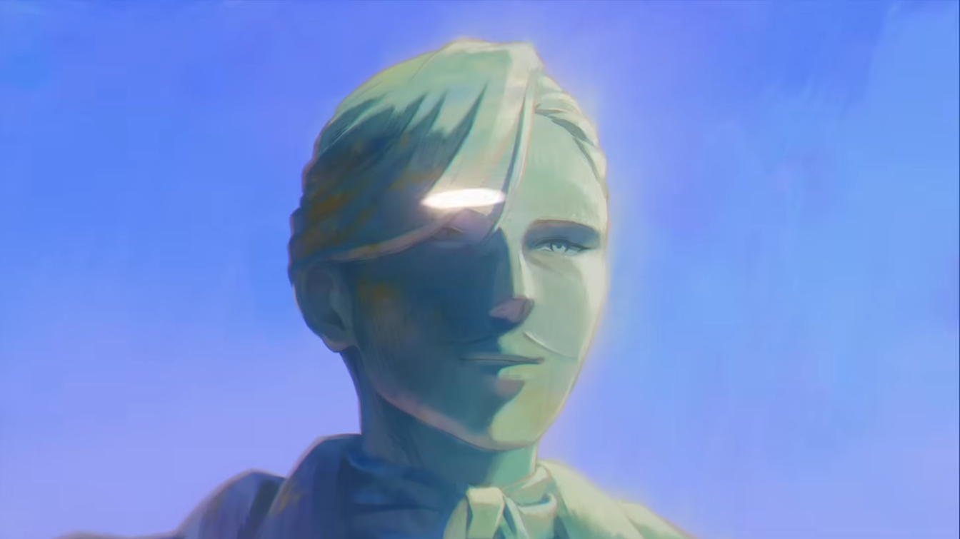 The new opening is incredibly beautiful. I especially like how when the beat of the song gets faster, we start getting cuts to Frieren's journey with Himmel's Party, until the day she went to his funeral, and then the next cut is Stark and Fern making a flower crown to her, while the chorus of the song plays, and in the end of the opening, Frieren just hugs Fern and Stark.