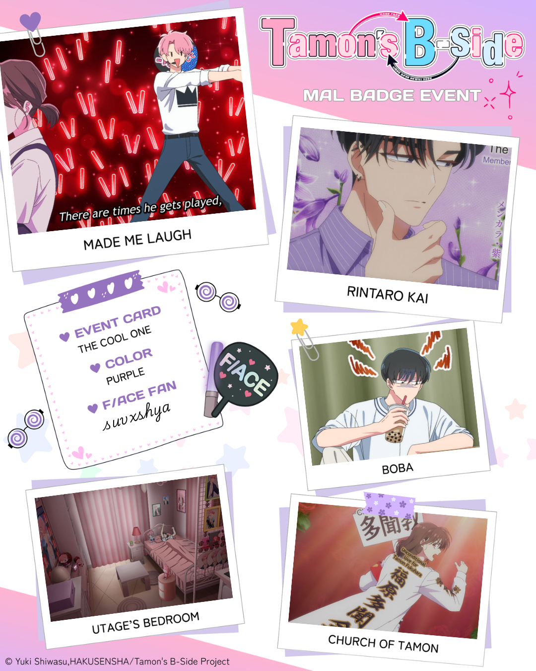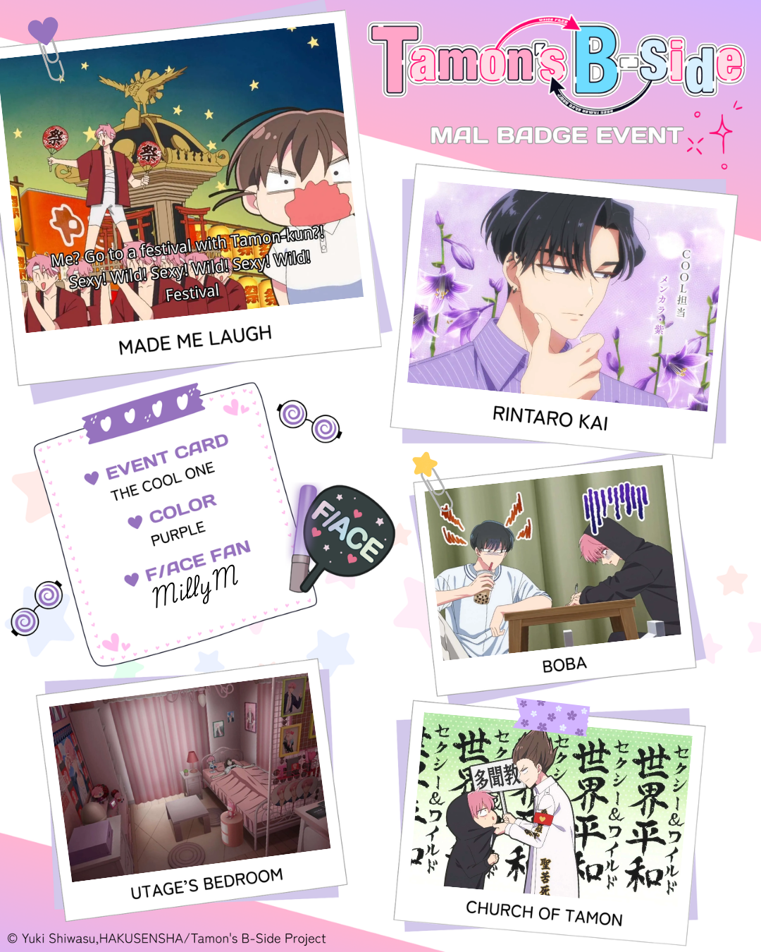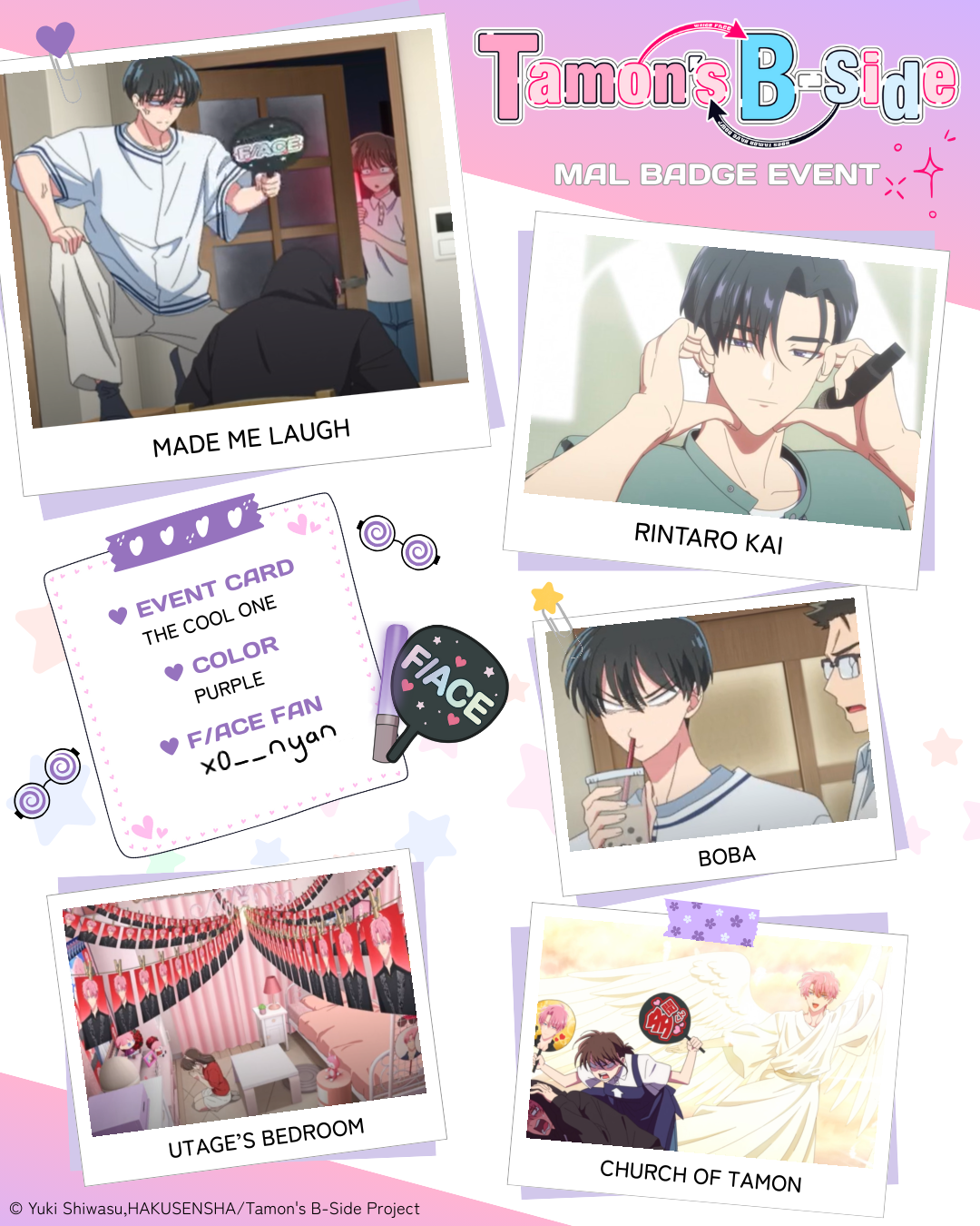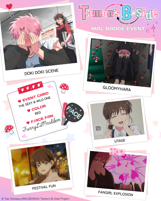 | Been wanting this to get an anime ever since i read the manga when it first started releasing in english! Love the adaption 🫶 Tamon-kun wa kami!! 1 - Doki Doki Scene: episode #7 2 - Gloomyhara: episode #2 3 - Utage: episode #6 4 - Festival Fun: episode #4 5 - Fangirl Explosion: episode #6 Color of badge you want: Purple |