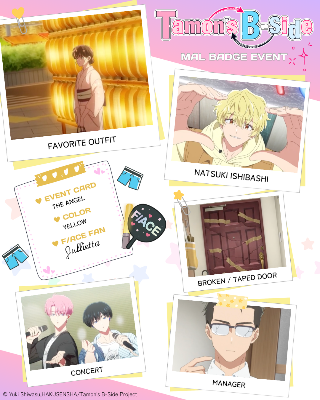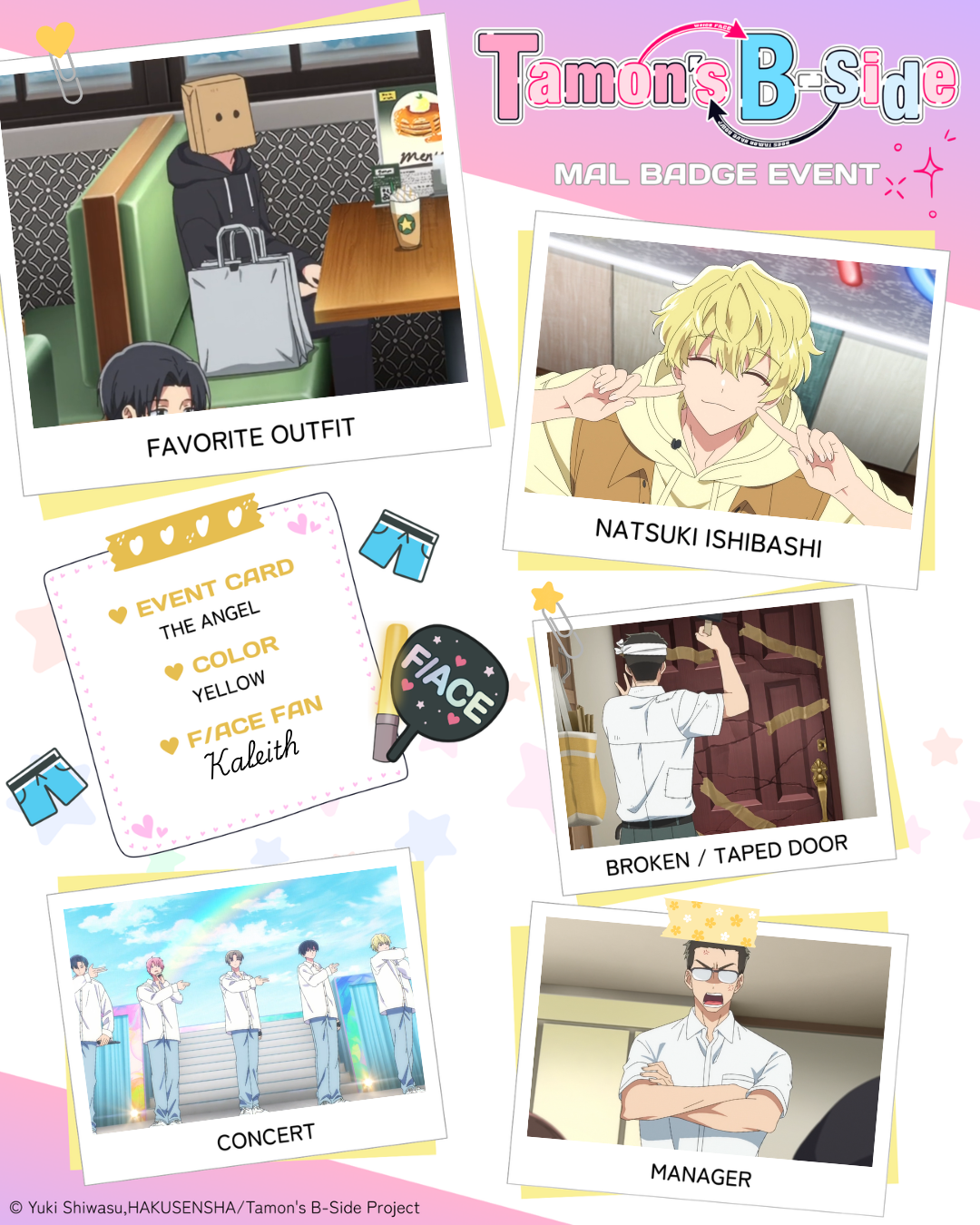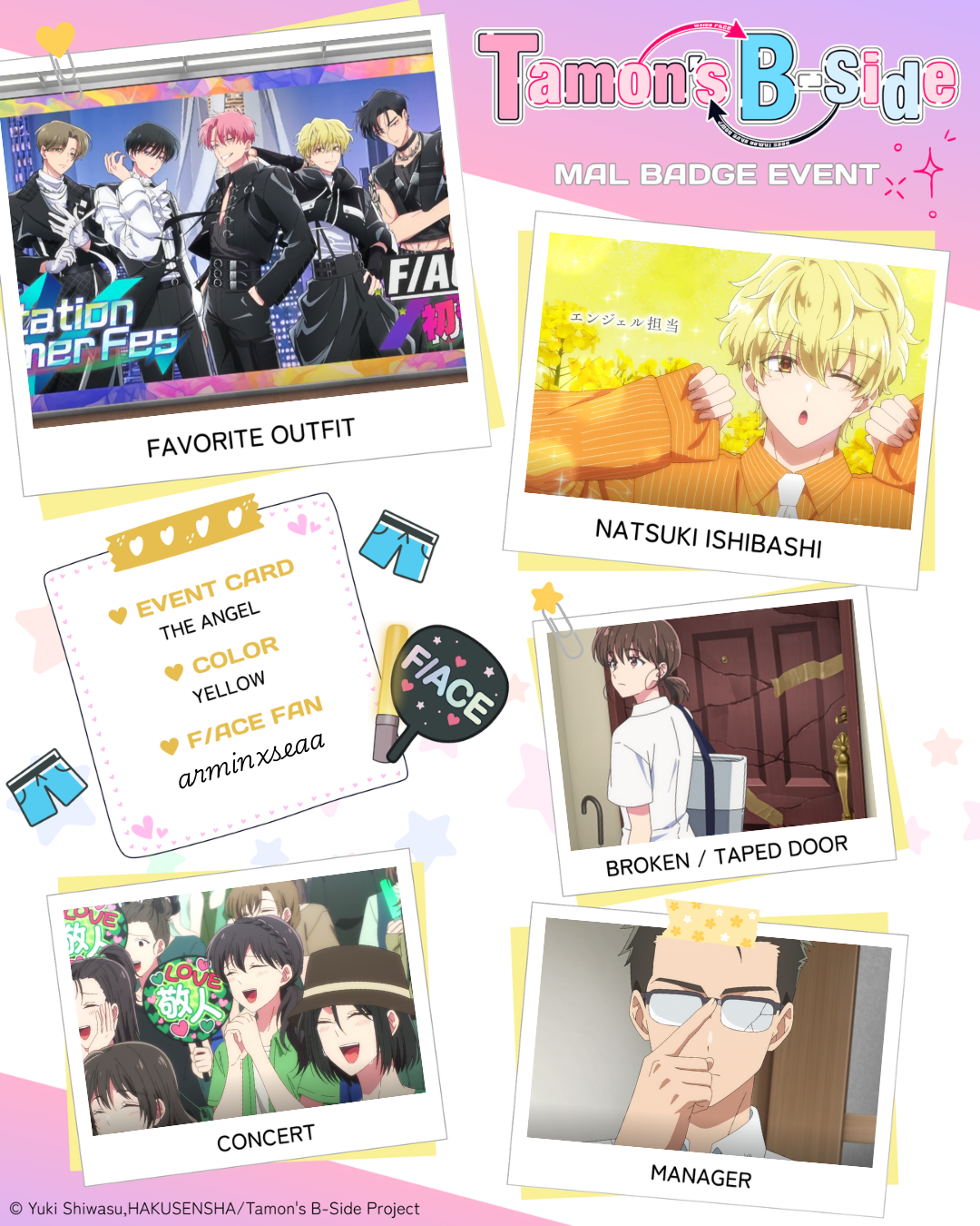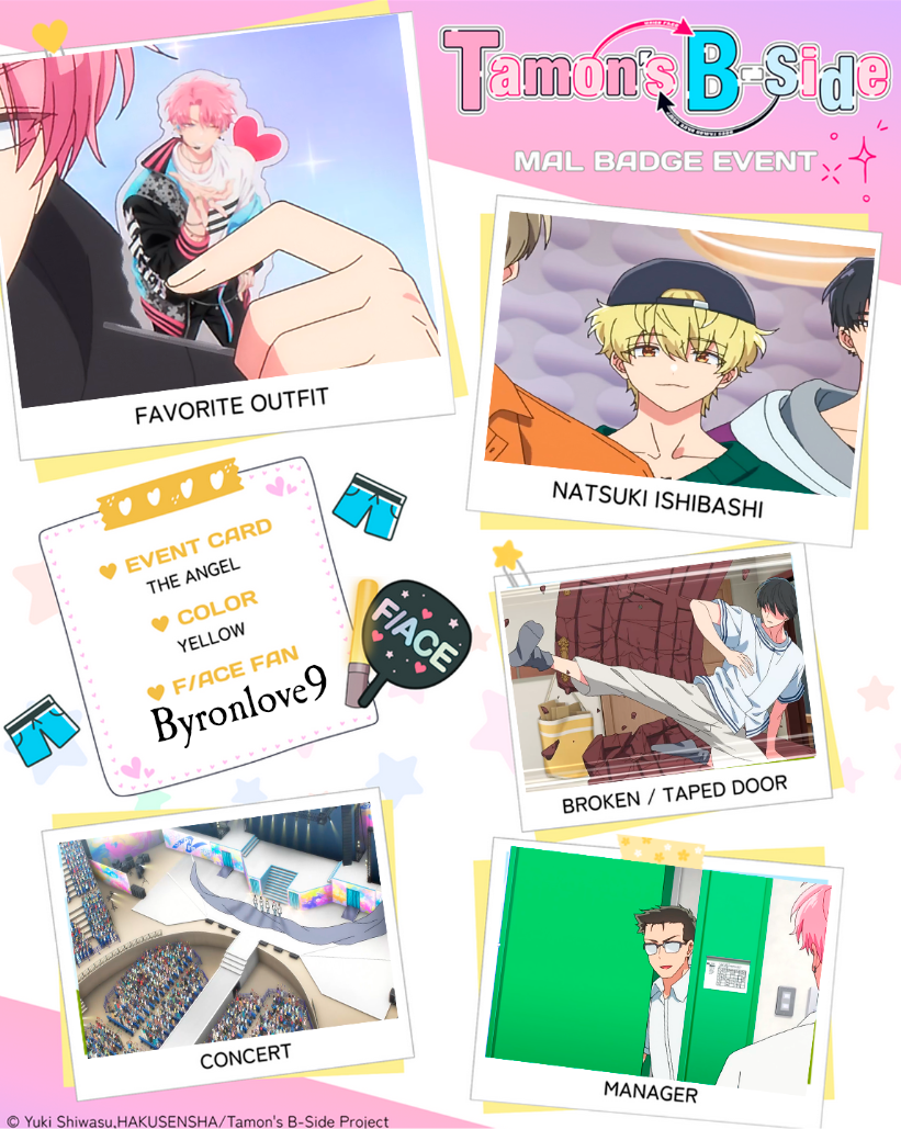 | I love Tamon sm ngl! 1 - Favorite Outfit: episode 5 2 - Natsuki Ishibaashi: episode 3 3 - Broken/Taped Door: episode 3 4 - Concert: episode 5 5 - Manager: episode 2 Color of badge you want: Yellow pls! |