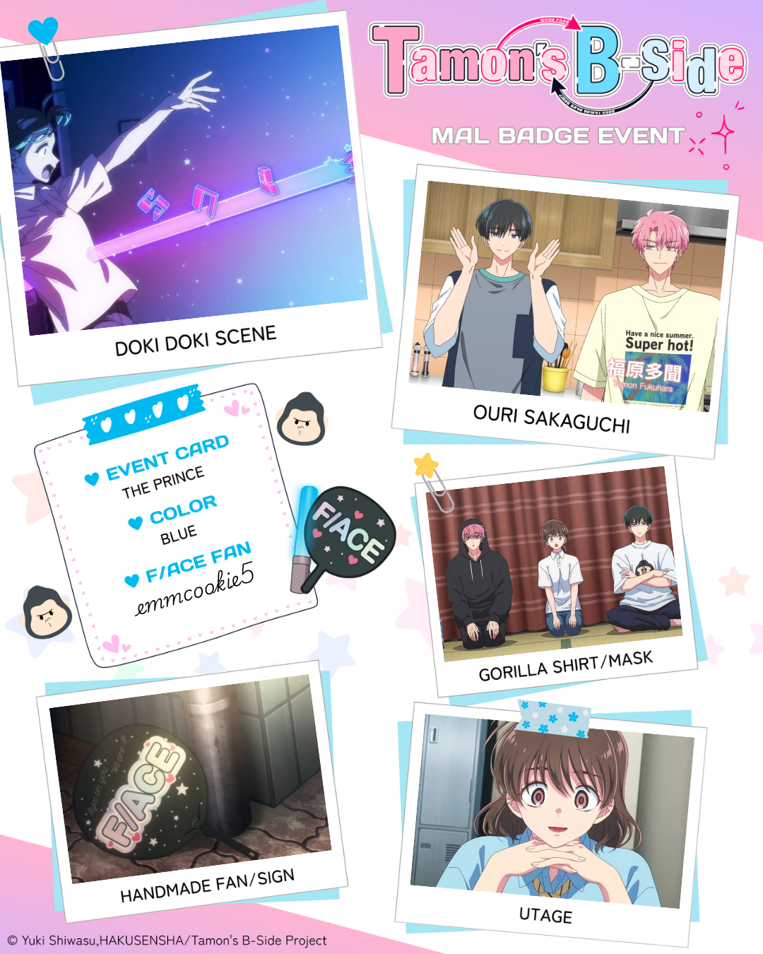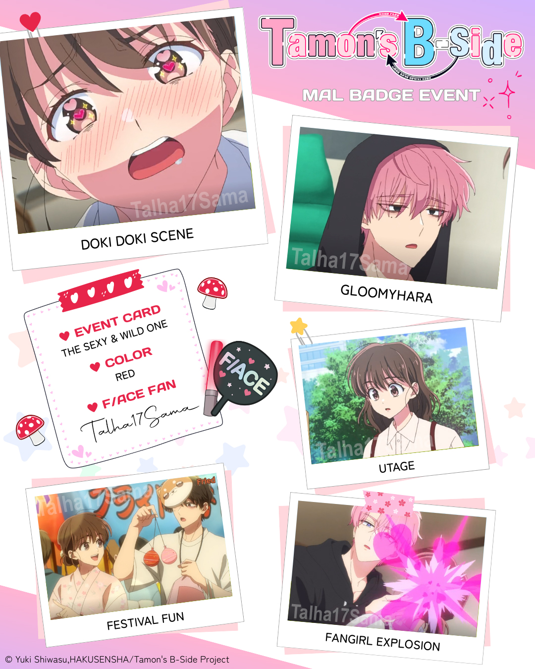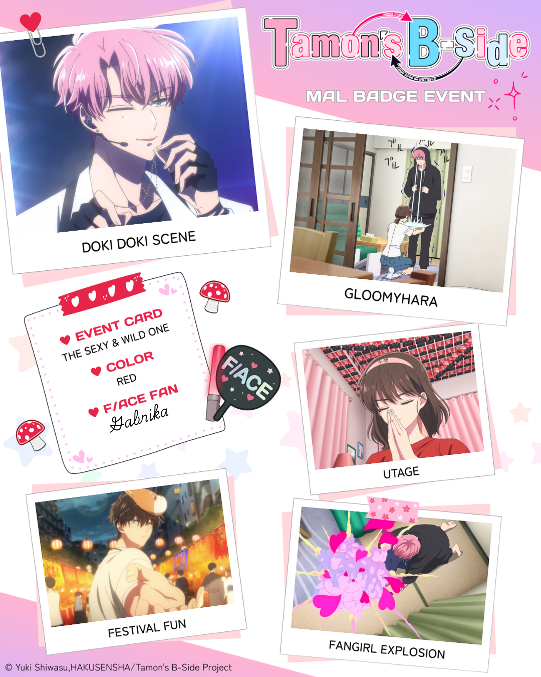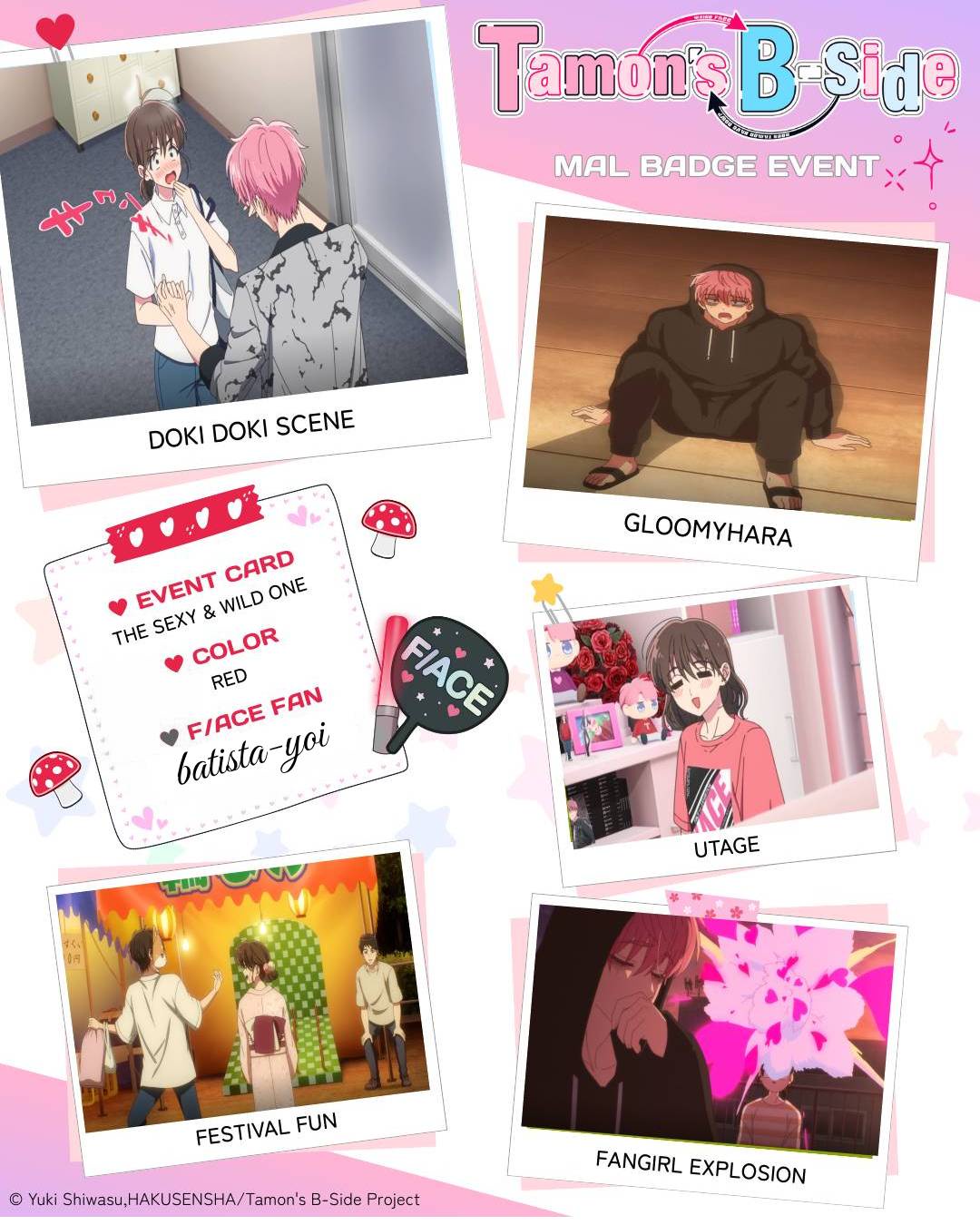 | I hope this works omg I love Tamon‘s B Side!! 💖💖 1 - Doki Doki Scene: episode 1 2 - Gloomyhara: episode 3 3 - Utage: episode 3 4 - Festival Fun: episode 4 5 - Fangirl Explosion: episode 2 Color of badge you want: Red |