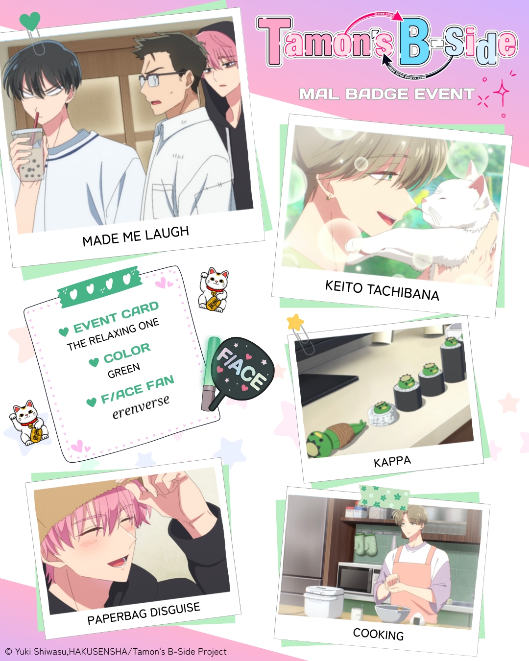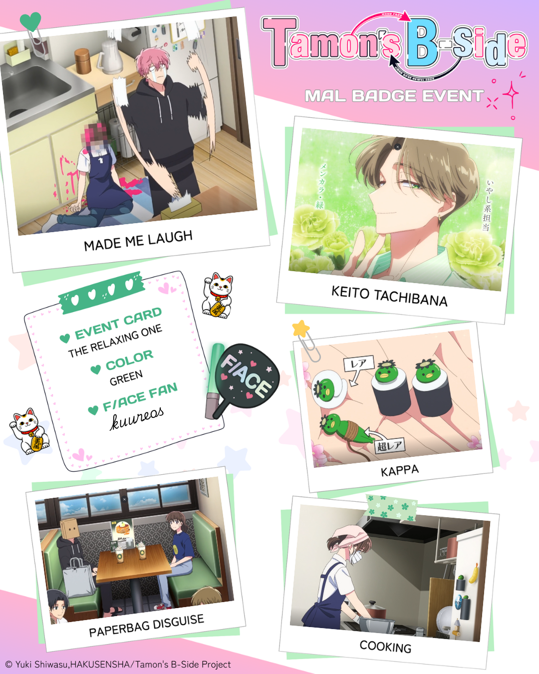 | I really like the Bingo Card events, they are so fun to do! 1 - Made Me Laugh: episode 5 2 - Keito Tachibana: episode 3 3 - Kappa: episode 7 4 - Paperbag Disguise: episode 2 5 - Cooking: episode 1 Color of badge you want: Green |