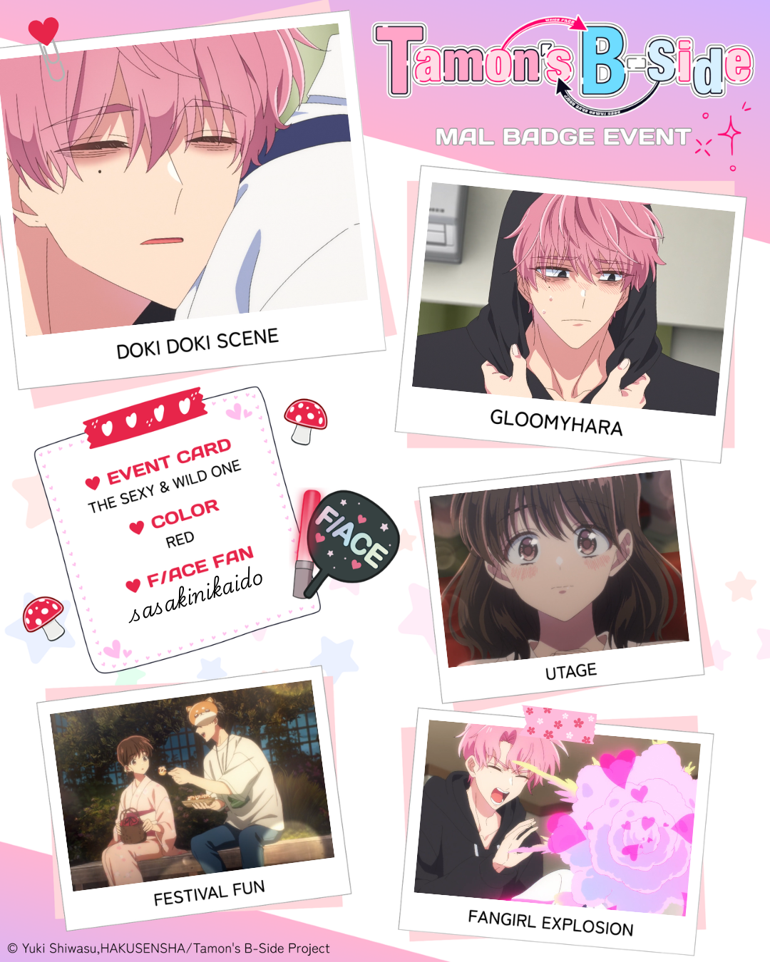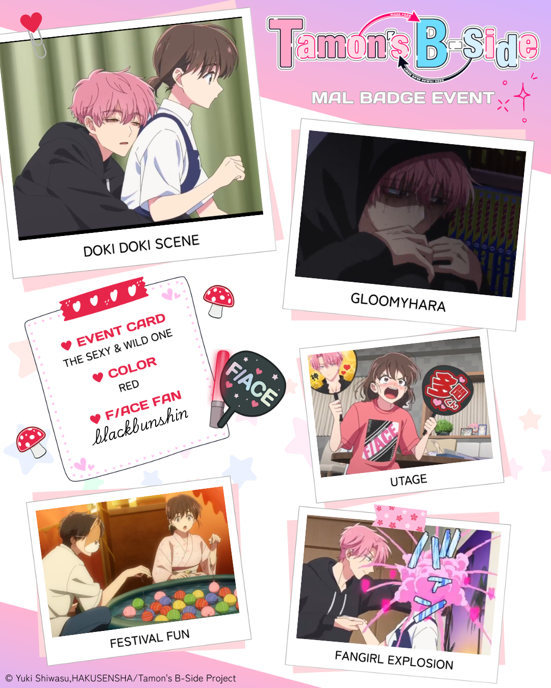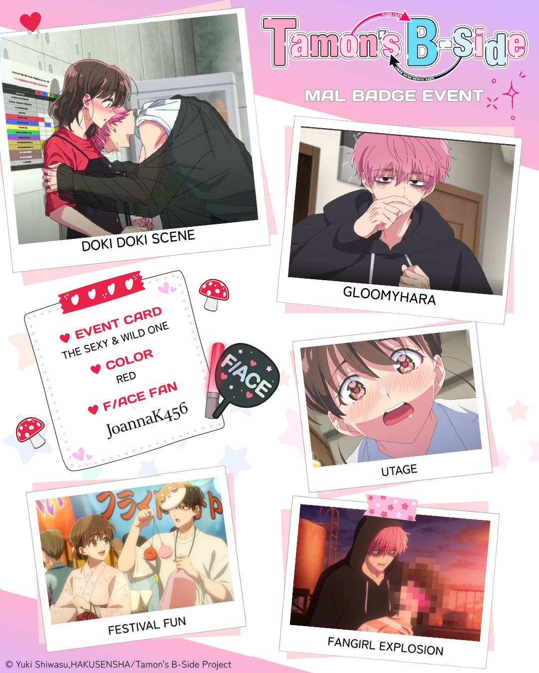 | 🍄🌸🍄🌸🍄🌸🍄🌸🍄🌸🍄🌸 1 - Doki Doki Scene: episode #5 2 - Gloomyhara: episode #2 3 - Utage: episode #1 4 - Festival Fun: episode #4 5 - Fangirl Explosion: episode #6 Color of badge you want: Red |