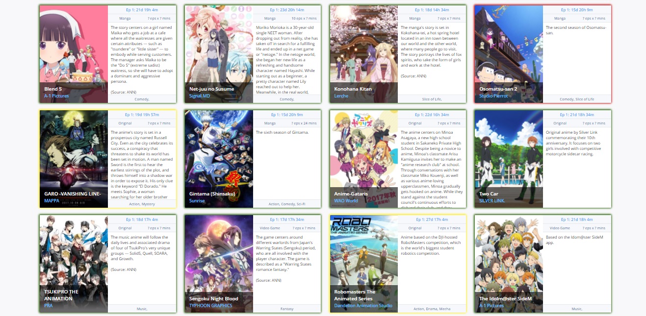 | Quite a lot of heavy hitting idol anime this season (including 2 from the same franchise, although I have zero interest in SideM) Konohana Kitan Cinderella Girls Gekijou Blend S WUG Season 2 Love Live Season 2 Shokugeki no Souma: San no Sara Two Car Kino no Tabi: The Beautiful World - The Animated Series |