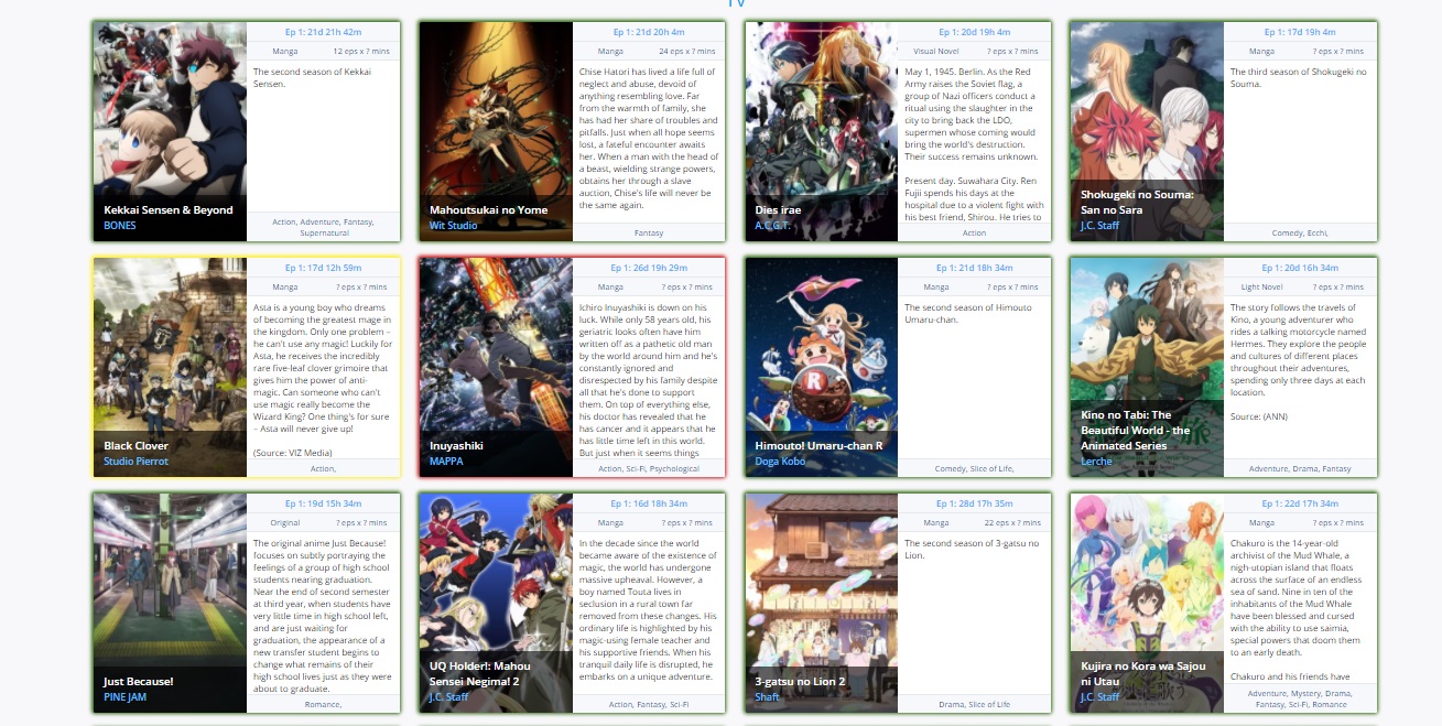 | Honestly I feel too lazy to write them down Lmao. I'm just gonna put a list in screenshots for now (don't know if this breaks anything or not, oh well) Green: Will watch / Probably gonna watch Yellow: Might watch / will save it for later Red: Will not watch (either I didn't liked the first series or I'm too skeptical to pick said shows up, or haven't seen prior entries) Will check the stuff I listed above the screenshots but I'm not too sure. But we'll have to see. I have most stuff on my watching and few into consideration whether I'll check them out or not. ... Yeah now that I look back at my own list I ask myself sometimes Lmao. xD |