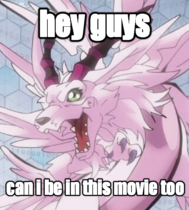 | I decided to make a "what if" scenario involving Holydramon/Magnadramon to keep me pumped/interested in seeing this film. The final Digimon Tri movie. Time to end it all. It’s the climax. Everyone’s in deep shit, but not without hope. Audience holds its breath. Ordinemon splits when everything falls apart. Not-Gennai loses his mind. Meiko and Kari’s Digivices glow. “Brave Heart” blares. Audience squirms in excitement. It’s time. Finally, all Mega Digivolutions will have been confirmed and shown. Gatomon Digivolves into Angewomon. Boners pop like clockwork. Angewomon’s Digivolution sequence begins. Audience braces self for cheers. Angewomon Digivolves into Ophanimon--the Vaccine attribute this time. Audience is confused, perhaps frustrated. The Ophanimon crowd cheers suddenly, having not expected this turn of events. Meicoomon’s turn to Digivolve. She becomes Meicrackmon, but not in Vicious Mode. Audience gasps, but no time to see her in action. Good!Meicrackmon’s Digivolution sequence begins. Still frustrated, audience grows uneasy. It’s coming. No one wants to believe it. Good!Meicrackmon Digivolves into Magnadramon. Audience flips its goddamn shit. Popcorn and drinks are tossed at the screen in fury. Cries of “Not canon!” echo and social media erupts in flames. No one but the most dedicated of fans learn how Tri ends. Final opinions are still split. Toei Animation cackles as they bathe in their piles of money the gullible fans had thrown at them for three years. Bandai puts in requests for a sequel series. |