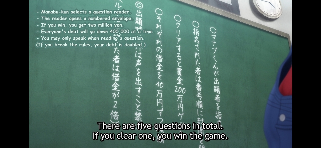 MumenWriter said: itsrj20 said: "Am i missing something?" literally bruh, complete the episode, watch at least first 3 episodes, then drop or whatever you want to do. How come you pause it in the middle, and just went to create a thread, without watching it till the end. (I am not saying anything regarding him been intelligent or not, just complete the episode, at least.) I completely agree that I could be missing something; that's why I asked. Like I'm more than willing to finish episode 2 and beyond if my question is answered in the remainder of the episode or even further episodes. I guess the point of this forum is to ask whether my question eventually gets answered or if it's just overlooked for the rest of the series in which case I would just not continue. I had this question at the end of episode 1 and I went into episode 2 hoping they would address it. The way episode 2 was heading, it seemed like they weren't ever going to address the fact that he asked the wrong question. So I guess I'm simply asking whether that eventually gets addressed or not. I guess, you are misunderstanding what was the situation was, in the first few episodes. Perhaps, because of poor translation or because you haven't completed it, yet. Anyway, Yuuichi thought, they all are friends, and there isn't any traitor(s) among them, until he got a wrong answer, for his (yuuichi's) question, then he realized there's a traitor, who was initially trying to put all the debt, on yutori. Now, as for your question, there were two conditions (afaik). The rule stated that, if the coin went to "yes", the game would be cleared, and if it went to "no", his debt would be halved. If he would have chose a better question (which he didn't, because of trust and what i am going to mention), it goes to "yes" and the game would have been cleared. But, they will loose in this situation, since he won't be able to meet the condition to half his debt (which is more imp than getting out of the game), unless he picks "no", and he won't be able to find out who was the traitor (another imp thing), who pushed everyone into this game. There was also a chance, that traitor will sabotage the question again as it was already happening, and end up with pushing all the debt, towards yutori only. (as i already said earlier) I ended up explaining/spoiling all of them, tho, i am anime only myself. |