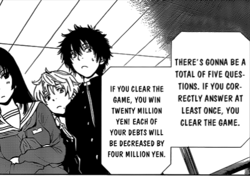 MumenWriter said: V1P3R0P said: MumenWriter said: So let me start by saying I've only seen the first episode and half of the second. In the first episode when they're playing the "Yes" and "No" coin game, Yuuichi is the reader for the fourth question. The way the game works is essentially the minority dictates the outcome if the vote is not unanimous. So if he wanted a "Yes" outcome, why wouldn't he ask a question with an obvious "No" answer and just vote "Yes"? Isn't that what the first three people did except just the inverse? They asked obvious "Yes" questions and just voted "No" to control the outcome. Instead, Yuuichi foolishly asks an obvious "Yes" question and expects the outcome to be "Yes" as long as he votes "Yes" which doesn't make any sense to me. Am I missing something here? I stopped watching halfway through the second episode because the show was trying to make him seem like a genius when he clearly made a stupid mistake. I also don't care to watch the rest of this so feel free to spoil if necessary. The question needs to be simple enough, everyone playing should know the answer, like "There are 7 days in a week". The rule doesn't mention the answer for the question should always be "Yes". A "No" question can also be asked. As long as the coin is pointing at the actual answer of the question, It will be considered a correct answer. Hence, if Yuichi asks a question with an obvious "No" answer and moves his finger towards the "Yes", It doesn't change a shit. By minority rule, It will still be a wrong answer for the question. And yes, He could've pointed to wrong answer like the person who was actually pointing to the wrong answer (Yes, There's a traitor). But it will still be minority, unless one other friend realizes what was happening and does the same. That makes the vote for correct answer a minority. Hence a correct answet. As seen in Yuichi's instruction, He has to sabotage the game if he wants to halve his debt. This, he assumed, was given to everyone except Kokorogi. So he assumed everyone there was trying to pin all the debts on to kokorogi Also, Game 1 and majority of game 2 doesn't show the true face of Yuichi. At the end of game 2 and onwards, the real deal happens, But this has been toned down a lot in anime version. My advise, read the manga. It has awesome art and crazy plot twists as the story goes on. Not sure if there's a difference in our translations, but in the episode I watched they translated his card like this: If the 10 yen coin goes to "yes," you clear the game. If the 10 yen coin goes to "no," only the reader's debt will be halved. Nothing was said about the actual correctness or incorrectness of the answer to the question. you are not wrong. The card did mention that. But that is not the actual rule of the game. ![]() The card did mention, taking the coin to Yes will win the round. But, as all here told, he trusted everyone, hence he didnt follow the instruction and went with a yes question and pointed at yes. After that round, it hit him that someone was trying to sabotage the game. Note: In the image above It should be 2 million Yen and 400 Thousand Yen. But there was a translation error iirc ![]() |