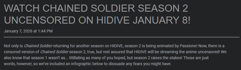 we don't want ANYTHING to be nerfed in ANY anime, but when it comes to a show like this you CANNOT nerf the ecchi off the top of my head 1. again, an ENTIRE CHAPTER (ch2) of BOTH ACTION AND FANSERVICE was skipped 2. the onsen scene with Nei and Himari was basically skipped over 3. theres a tentacle scene or 2 that were removed (one includes either Yuki's sister or the one that looks like her) people were posting about it in s1's forums if you wanna try to find them like i said before, s2 is ADDING fanservice, while s1 removed it, NOTHING has been "removed" this season, unless you count the filler recap at the beginning of ep 1 and the villain scenes being skipped, most likely for the next arc this season is basically a 180 of season one, HIDIVE even acknowledged that people were disappointed w season 1s adaptation, if that doesn't tell you how angry people were |