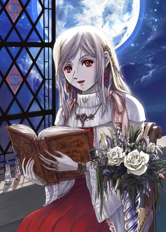 General appearance: Her eyes are always red; showing that she drinks only human blood (goes outside of school for that), while humans usually think that those are special contact linses, for reading, and she always wear them, since most of their time, they are looking in a book. Her eyes almost all the time seem col, yet melancholic and nostalgic.