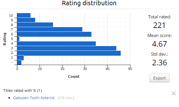 See the whole problem with this "I wouldn't want to watch a 5 because 5 is only average why watch a 5 when you can watch a 7" crumbles apart when you realize that you might have a different opinion from the person scoring it. Many people also base what they want to watch on superficial reasons, such as length. Legend of the Galactic Heroes has barely over 100k people despite being ranked #6 currently, making it the #680 in popularity. This makes it about as popular as titles such as Ladies versus Butlers! and Devil Survivor 2 The Animation. Have you ever heard of these? Logically if everyone followed this so-called-philosophy of only watching highly scored things the popularity and rating ratio would be 1:1, which it is obviously not. Hoax!