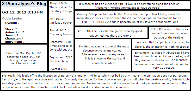 There's plenty of other arguments against traditional scoring. Almost all ratings combine ratings such as giving 10/10s in story and artwork, 8/10 characters, a 4/10 soundtrack then proceed to undercut this and manage to give the show a 7 or an 8 overall. Despite having ideally perfect art and story and great characters, the soundtrack is scored with as much weight as the animation and bogs down the overall unfairly, which is clearly a flawed system. The only other review type is people that attempt to be subjective and factual at the same time, giving 9s in art, soundtrack, story, etc. yet giving the overall or enjoyment a 5 or 6 for literally no reason other than claiming some bullshit about how the presentation was lacking or something. While I disagree with the limits in rating by ones, I'd much prefer a 8 than a "meticulously calculated" 7.91747284583327 score. A final nail in the coffin is how 6 and under marks shows not worth watching almost 100% of the time. That makes literally all scores 6 and under effectively useless, with shows 5 and always being marked as something you shouldn't ever see. Might as well use a 5-star system in that case.