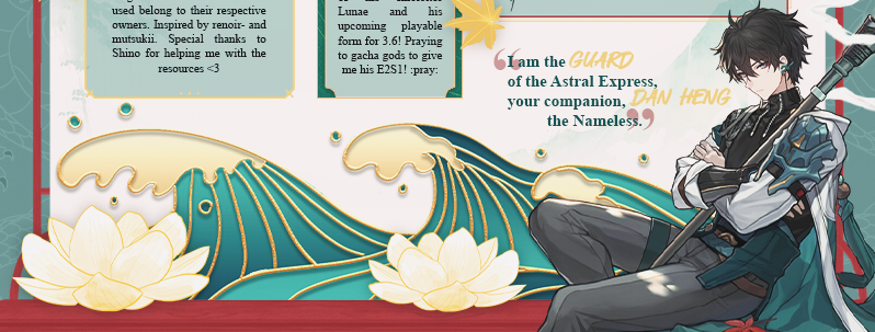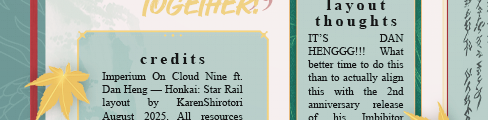 thank you!! was kinda nervous about this layout since it's different from my previous one but happy to hear that it turned out well :] yeah i've used different colors schemes for forum signatures in the past ignore the fact that my most recent one uses blue, i do use other colors i promise! :p i do plan on trying a new color scheme for my next layout, though i can't decide which character to pick between firefly, saber and kafka. i do have some ideas for them that could be be interesting except for kafka, i'll need to think of something that will stand out since there's already incredible designs that users have made for her. all the best with the layout! really looking forward to it :]