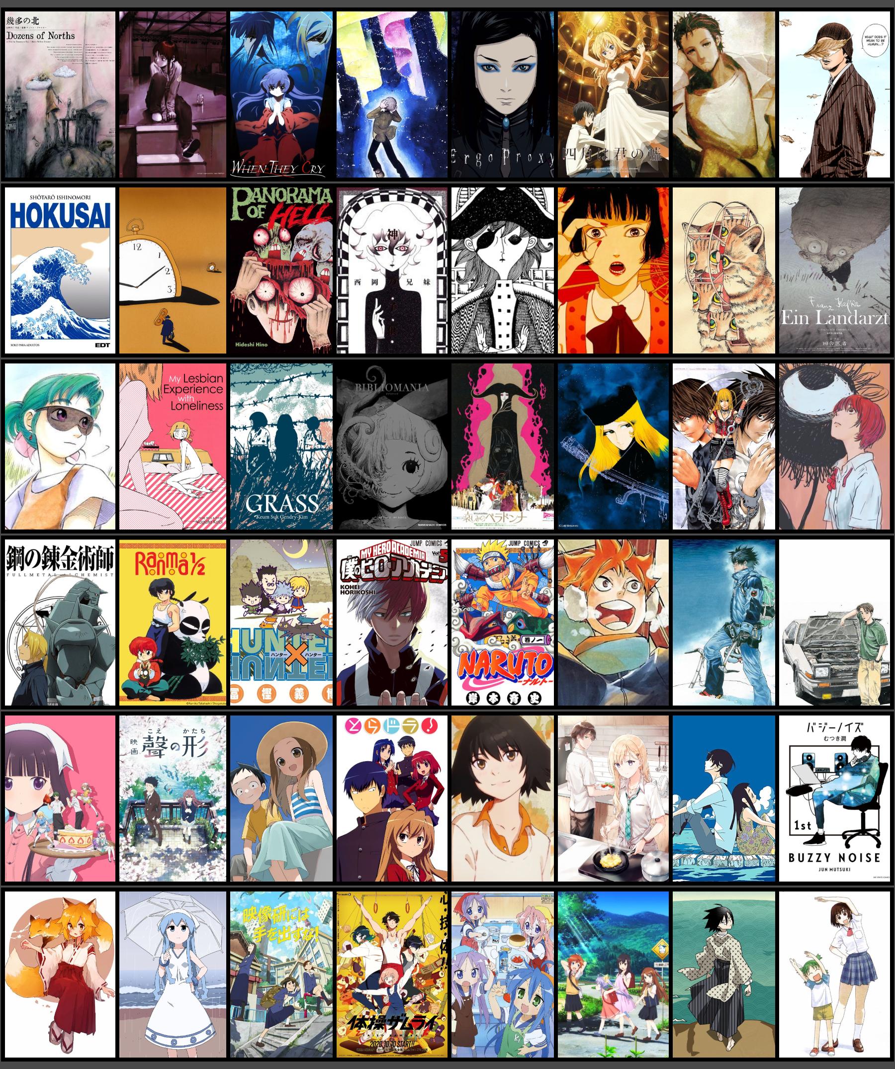 1. Ikuta no Kita | 2. Serial Experiments Lain | 3. Higurashi no Naku Koro ni | 4. Jun: Shoutarou no Fantasy World | 5. Ergo Proxy | 6. Shigatsu wa Kimi no Uso | 7. Steins;Gate | 8. Homunculus | 9. Hokusai (Shoutarou Ishinomori) | 10. A Piece of Phantasmagoria | 11. Jigokuhen: Aru Jigoku Eshi no Kokuhaku | 12. Kami no Kodomo | 13. Kono Yo no Owari e no Tabi | 14. Chika Gentou Gekiga: Shoujo Tsubaki | 15. Artes de Shintarou Kago | 16. Inaka Isha | 17. Yokohama Kaidashi Kikou | 18. Sabishisugite Lesbian Fuuzoku ni Ikimashita Report | 19. Grass | 20. Bibliomania | 21. Kanashimi no Belladonna | 22. Ginga Tetsudou 999 | 23. Death Note | 24. Aku no Hana | 25. Fullmetal Alchemist | 26. Ranma 1/2 | 27. Hunter x Hunter | 28. Boku no Hero Academia | 29. Naruto | 30. Haikyuu! | 31. Kokou no Hito | 32. Initial D | 33. Blend S | 34. Koe no Katachi | 35. Karakai Jouzu no Takagi-san | 36. Toradora! | 37. Yesterday wo Utatte | 38. Gimai Seikatsu | 39. Kakushigoto | 40. Buzzy Noise | 41. Sewayaki Kitsune no Senko-san | 42. Shinryaku! Ika Musume | 43. Eizouken ni wa Te wo Dasu na! | 44. Taisou Zamurai | 45. Lucky Star | 46. Non Non Biyori | 47. Sayonara Zetsubou Sensei | 48. Yotsuba to!