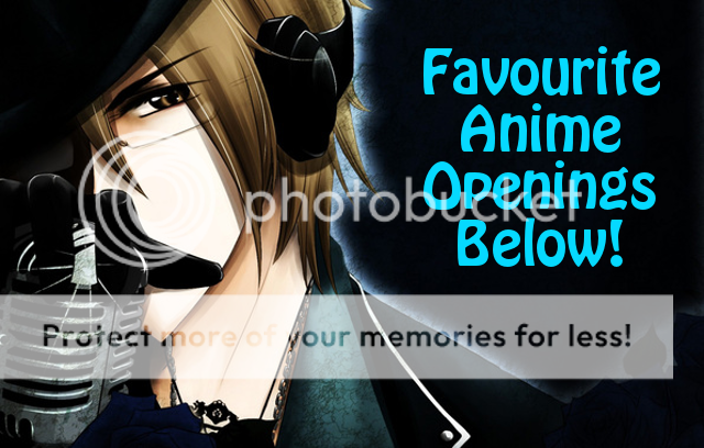 List of favorite openings: (Videos below) Steins;Gate Noragami Kuroko No Basket opening 1 Kuroko No Basket opening 3 Kuroko No Basket opening 4 Blue Exorcist opening 1 Deadman Wonderland Sword Art Online opening 1 All Bleach openings All Fairy Tail openings Naruto Shippuden opening 15 Psycho Pass opening 1 Chobits Death Note opening 1 Fullmetal Alchemist opening 3 Code Geass opening 1 Black Bullet Higurashi opening 1 Jormungand opening 1
