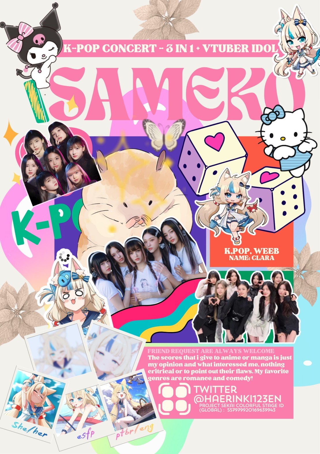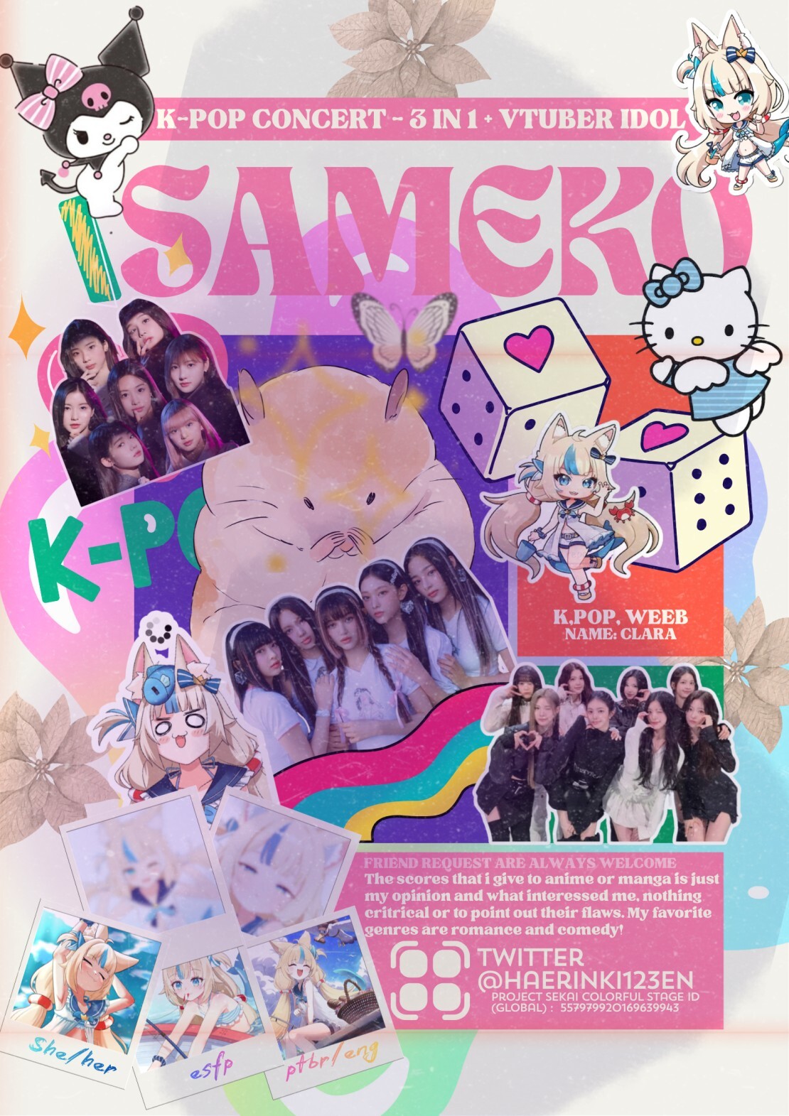 Alguns fandoms que eu gosto: Pjsk, Newjeans, Hearts2hearts, Alien Stage, Hololive, Needy Streamer Overlord, Sabrina Carpenter, jfashion, tamagotchi, vocaloid, hellaverse, sanrio, babymonster, chiikawa, e muito mais...!